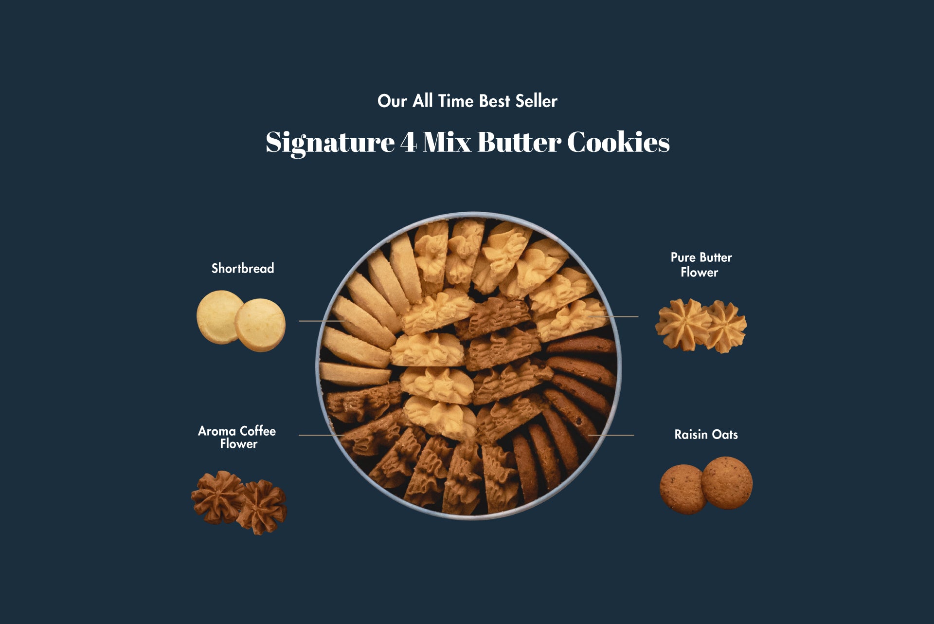 The “Best-Seller” Signature 4 Mix Butter Cookies consists of our signature Pure Butter Flower, Aroma Coffee Flower, Shortbread & Raisin Oats.